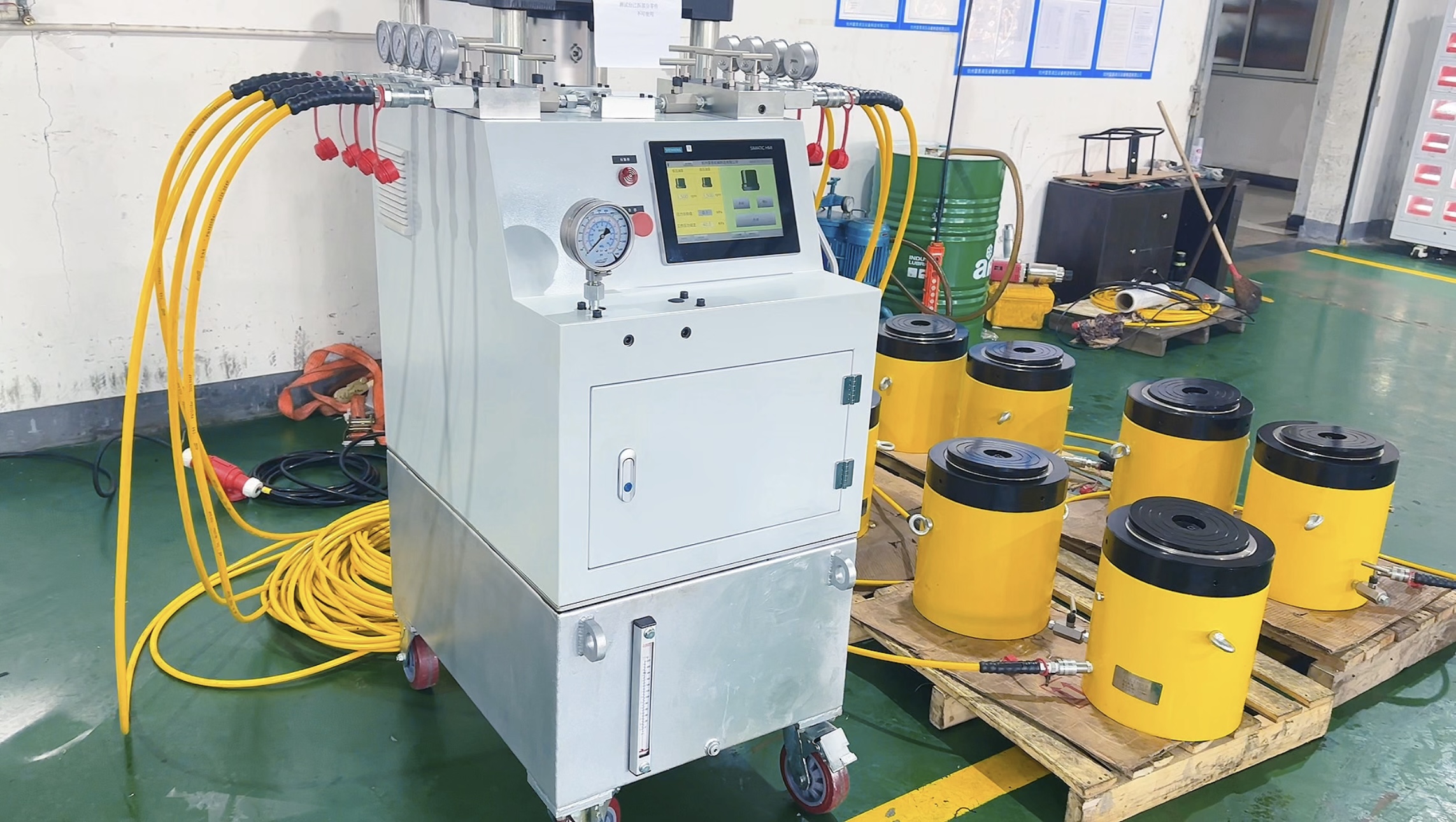 由液壓動力源、電(diàn)液控制系統、8套位移檢測(cè)裝置組成。液壓動力源由 1台電(diàn)液一體泵組、1套PLC控制裝置、1套電(diàn)控系統組成。 電(diàn)控系統是由操作控制台、電(diàn)機、驅動器、屏幕等組成。